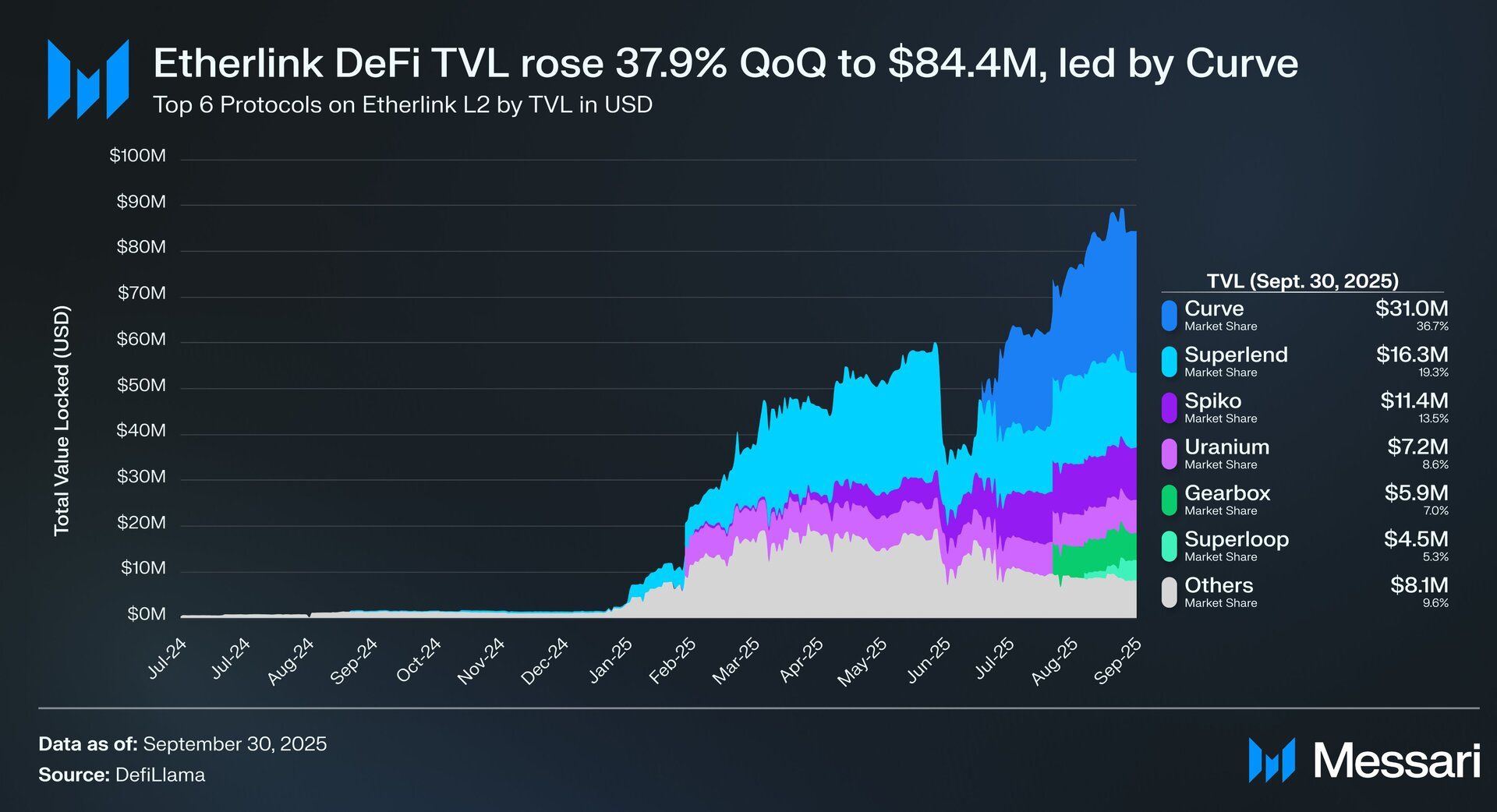 DeFi tells another important part of the picture. Tezos Layer 1 DeFi TVL climbed to 45.1 million dollars in Q3, up 13.1% from the previous quarter, with Youves alone reaching 31.4 million and holding close to seventy percent of L1 TVL. On Etherlink, TVL was more volatile. After a sharp mid-July drawdown, it rebounded more than 200% from the local low and finished the quarter at about 61.2 million dollars, up 46.9% overall. That recovery was driven by new programs and venues like Curve, Superloop, and the second season of Apple Farm incentives.